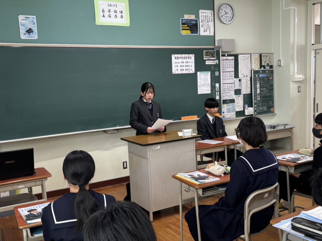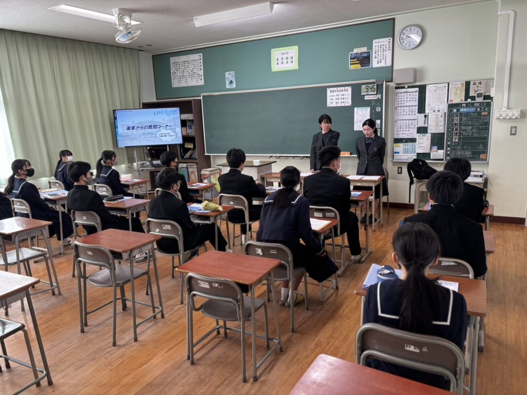 本日は有明中学校様が進路指導の一環として取り組んでいる「先輩に学ぶ」授業という内容でした。本校の有明中学校出身生徒4名が、本校の特色や、自身の今後、中学生時代の思い出や受験エピソードを話しました。