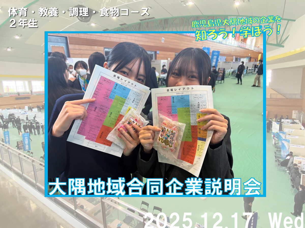 12月17日(水)、本校体育・教養・調理・食物コースの2年生が鹿児島県大隅地域合同企業説明会に参加しました。串良アリーナで行われたこのイベントは、鹿児島県大隅地域振興局主催で行われた企業説明…